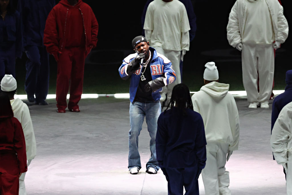 Olivia wore an oversized black jacket over a shirt, tie, and relaxed trousers for a full menswear moment. She finished it with chunky black shoes, black glasses, and sleek high afro-puff ponytail.