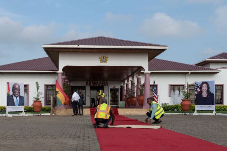 People roll out a red carpet before Harris’ arrival in Accra, Ghana.