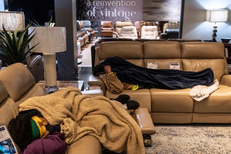 People sleep on couches while taking shelter at a furniture store that opened its doors and transformed into a warming station in Houston on Feb. 18.