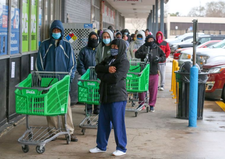 Customers wait in line to enter a grocery store in Houston on Feb. 17.