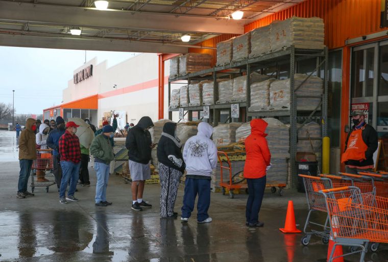 Customers wait outside at a Home Depot in Pearland, Texas, on Feb. 17. The store would only let one person in at a time because it had no electricity.