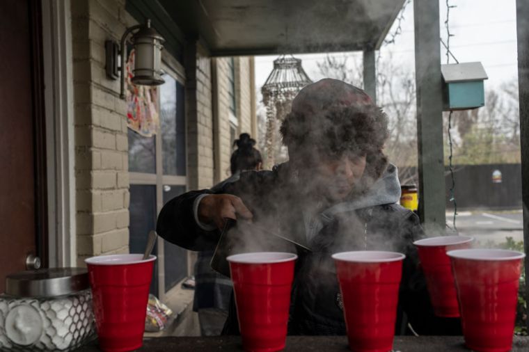 A man makes hot coffee during a power outage in Houston on Feb. 16.