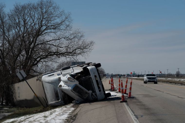 A large trailer truck is seen flipped sideways on Highway 59 in Pierce, Texas, on Feb. 16.