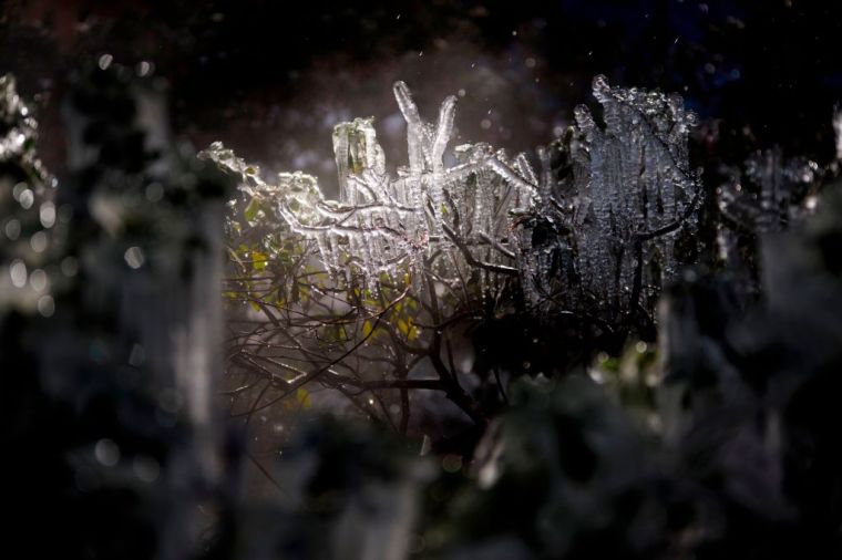 Icicles form on a bush in downtown Houston on Feb. 15.
